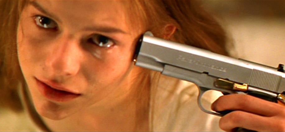 In this scene Romeo comes upon his love’s apparent dead body and ingests poison to join her slumber. As he is getting ready to take the poison Luhrmann cuts between him and shots of Juliet stirring. If Romeo would only look down he could see her moving and the tragedy could be avoided. He doesn’t see her movement however and he takes the poison just as Juliet wakes up and Juliet is forced to watch him die. As Juliet then takes up Romeo’s gun to join him the film is silent. The only sound is Juliet’s sobs and the click of the gun being readied to fire. In this scene the audience is holding their breath, willing the outcome to change, and the silence of the scene represents that. The gunshot is the audience releasing that held breath as the destined, tragic end comes to it’s fateful conclusion.